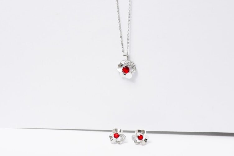 Conjunto rosa botao 3petalas sobrepostas sendo uma com cravaçao pave, miolo vermelho – 45cm mini elos: 42 + 3cm extensor